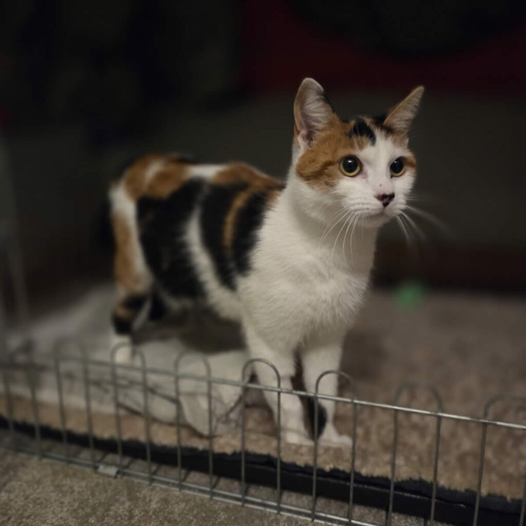 Ivy is a beautiful young calico girl who came into our care after being rescued from Uxbridge. She arrived pregnant and sadly miscarried, but she has since made a full recovery and is now thriving.